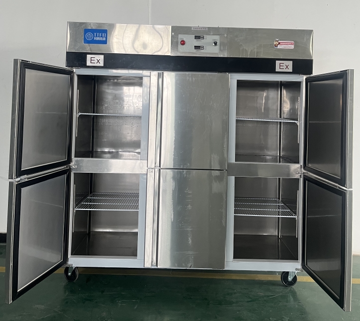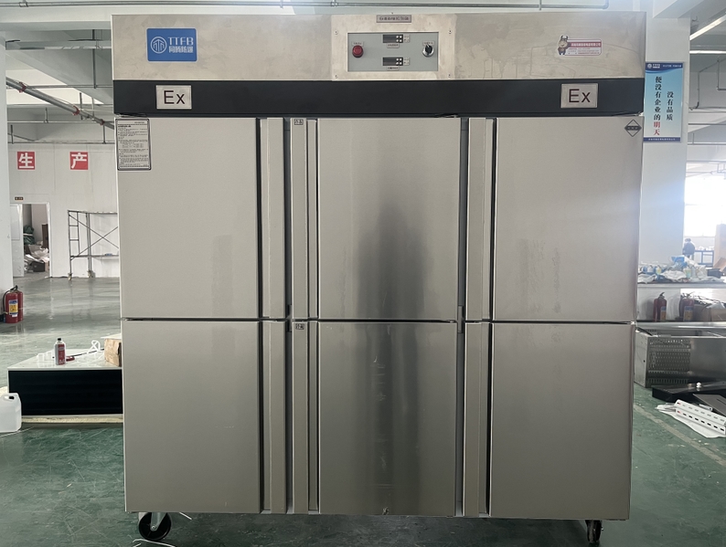 我公司生产的六门不锈钢同腾防爆冰箱(以下简称防爆冰箱),产品防爆要求是根据GB3836.1-2010《爆炸性环境 第1部分:设备 通用要求》、GB3836.2-2010《爆炸性环境 第2部分:由隔爆外壳“d”保护的设备》、GB3836.4-2010《爆炸性环境 第4部分:由本质安全型“i”?;さ纳璞浮贰B3836.9-2006《爆炸性气体环境用电气设备 第9部分 浇封型“m”》及GB3836.15-2017《爆炸性气体环境用电气设备 第15部分:电气装置的设计、选型和安装》的规定制成防爆结构,经国家授权的质量监督检验部门检验合格,其防爆标志为ExdbibmbⅡCT4 Gb。适用于工厂存在或可能存在ⅡA、ⅡB级、ⅡC,T1~T4组可燃性气体、蒸气与空气混合形成的爆炸危险1区或2区场所。该产品经国家防爆电气产品质量监督检验中心检验合格并取得了防爆合格证??盏骰惴菏视糜谑?、化工、冶金、制药和国防工业等空气中存在爆炸性气体混合物的自封闭的室内之用。